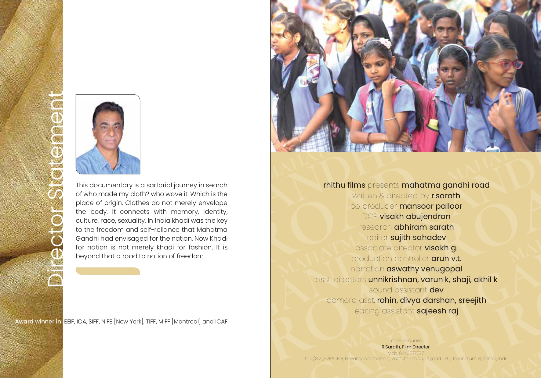 Who made my cloth ? Khadi was the key to the freedom and self-reliance that Mahatma Gandhi had envisaged for the nation. The narrative pitch of the documentary finds out how well the Gandhian vision of self-reliance and Swaraj that would be able to cope with the modern day life style. Khadi, which was once a symbol of freedom has become a mere dress code for those who follow the great ideologies of freedom movement.. It is also very important to see how the fashion movement and Gandhiji were interrelated. Gandhiji disrobed himself for the sake of the nation .During the freedom movement, he spearheaded certain indigenous artefacts and traditions got established as symbols of freedom .One of the most prominent among these symbols was the Khadi. Ultimately the documentary film is not only a journey in pursuit of who made my clothes, who wove this, which is the place of origin but also after all a kind of search for the soul of India. Without showing Mahatma and mother India the film scans the growth of her mind through Mahatma Gandhi Road.